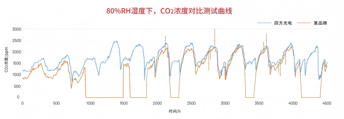 在实验室80%RH湿度环境中,历经六个月的CO₂动态浓度测试,AM4203H-CO₂始终保持稳定运行;而某品牌抗高湿CO2变送器仅在一个月后便出现信号中断,此后数据频繁异常。